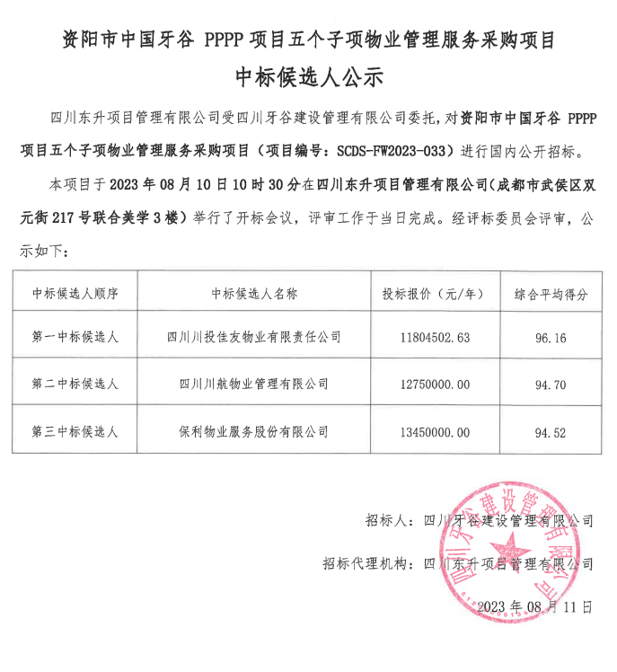 资阳市中国bv伟德国际1946PPP项目五个子项物业管理服务采购项目中标候选人公示