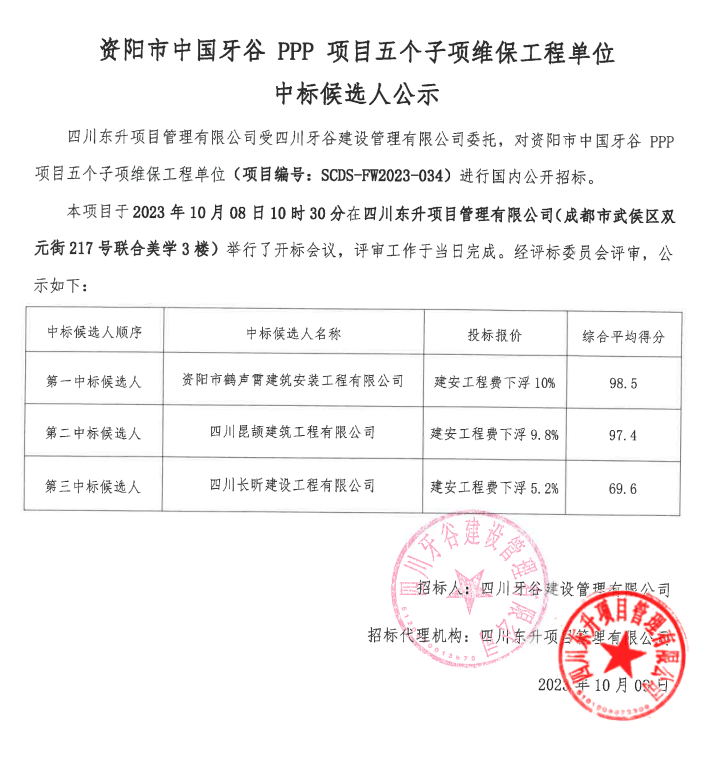 资阳市中国bv伟德国际1946PPP项目五个子项维保工程单位中标候选人公示